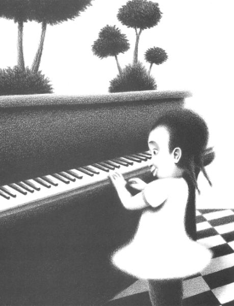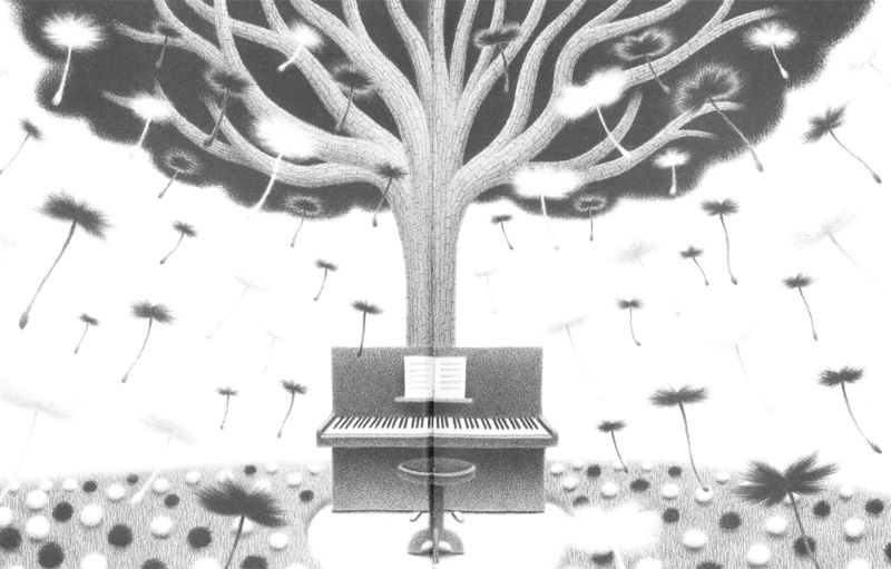 Le illustrazioni in bianco e nero di Bruno Liance suscitano in noi emozioni che i colori non sarebbero riusciti a fare in egual modo, toccando le note più nascoste della nostra sensibilità, e appunto di note, di musica e di pianoforte si parla.