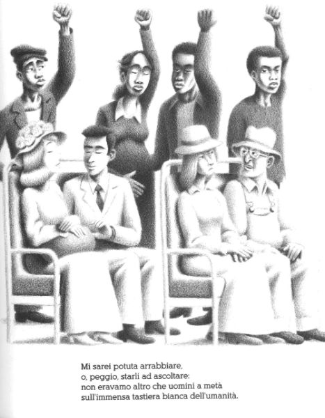 Toccante il passaggio dove Nina, ancora bambina che si approccia per le prime volte al pianoforte, chiede al suo maestro perché il pianoforte abbia 52 tasti bianchi e belli e 36 neri più piccoli incastrati tra i bianchi e allineati come piccoli soldati...”a solfeggio imparavo che due neri valgono quanto un bianco, e la sera sul bus non potevi sederti se eri stanco”.