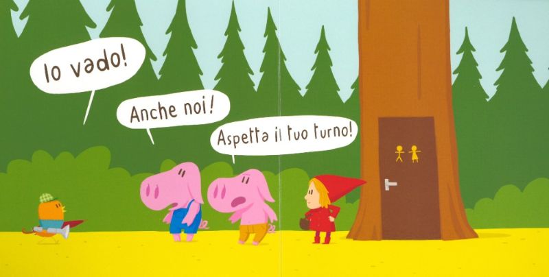 Poco dopo arriva un maialino ma anche lui deve aspettare. «È urgente!» urla un secondo maialino ma non ha altra scelta se non quella di mettersi in coda. «Io vado!» dice l’uccellino, però gli altri gli dicono che, purtroppo, c’è da aspettare. Nel frattempo chi sta occupando il bagno sembra non avere particolare fretta di lasciarlo libero, e infatti lo sentiamo dire “2 secondi che mi rimetto le mutande!” e, di lì a poco, “tiro su i pantaloni, mi lavo le mani e…” Tutti quanti sono ormai davvero spazientiti, eppure quando finalmente la porta si apre… «Ahhhhhhh!!!»
