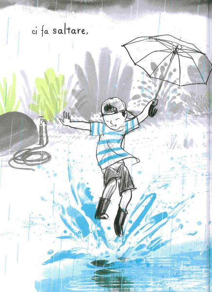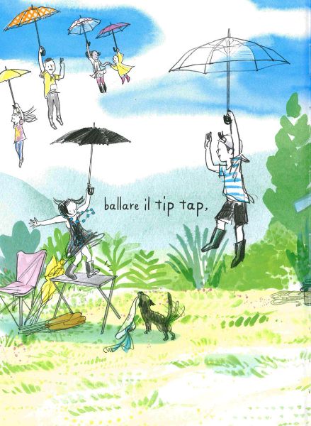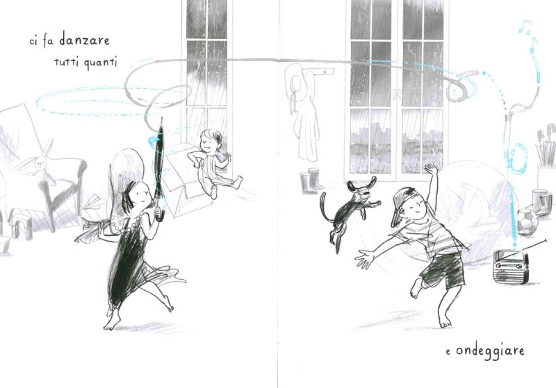 Le note della musica che si diffondono nella stanza acquistano subito un’aria frizzantina e giocosa dipingendosi di un bell’azzurro, le bimbe subito scattano sull’attenti e anche il cane si stiracchia. È il momento giusto per scacciare la malinconia e la pigrizia e iniziare a volteggiare, a ballare, a divertirsi mentre le note azzurre si fanno via via sempre più presenti e iniziano a tingere anche i vestiti dei bimbi, la collana, l’ombrello, il cappello, gli stivali della pioggia.