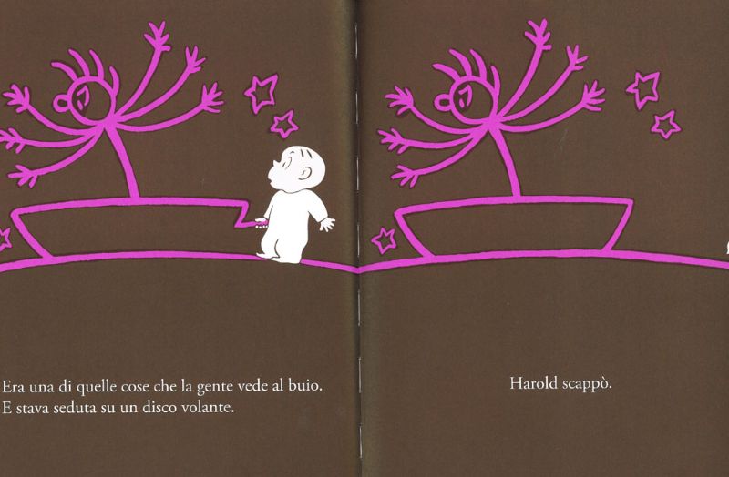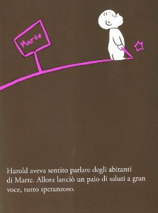 Non mancheranno pericoli, avvistamenti di dischi volanti, incontri con alieni… Per fortuna Harold ha sempre con sé la sua matita viola! Perché si sa, la nostra stessa fantasia potrebbe a volte spaventarci, un volto di un alieno farci fremere, e allora via via veloce a disegnare altra superficie sulla quale poter scappare a gambe levate!