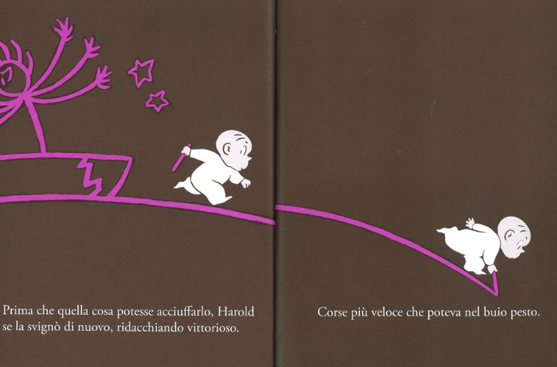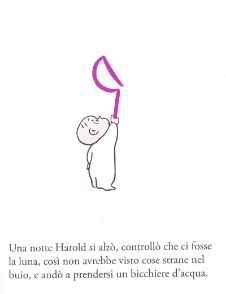 Oggi abbiamo il piacere di presentarvi un bimbetto, Harold, piccolino ma con un grande dono: la sua immaginazione! Harold viaggia sempre con la sua matita viola, pronta per essere utilizzata quando ad Harold la quotidianità va un po’ stretta… ecco allora che le pagine bianche del suo quaderno (e della nostra vita) iniziano a tingersi di un viola intenso che trasporta noi lettori in meravigliose avventure insieme al nostro protagonista.
