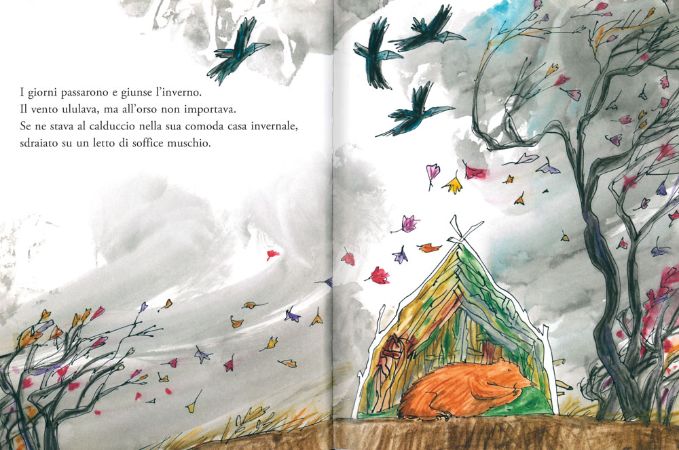 La storia de “La casa invernale dell’orso” (Camelozampa) ci immerge subito nel folto di un bosco i cui alberi hanno ormai foglie gialle, rosse, arancioni che iniziano a essere sparpagliate sul soffice terreno da una leggera brezza.