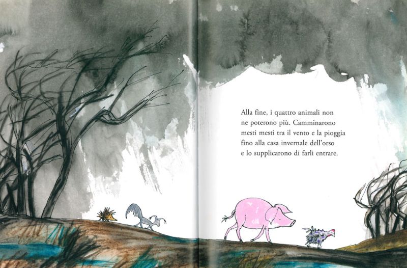 La curiosità ha la meglio e i piccoli animaletti sbucano fuori dal loro nascondino per chiedere spiegazioni a orso che inizia a dire: “Ogni inverno, quando dovrei dormire, mi sveglio pieno di brividi. Ma questo inverno non andrà così. Guardate questo foglio.”, e mostra loro il progetto di una casa invernale.