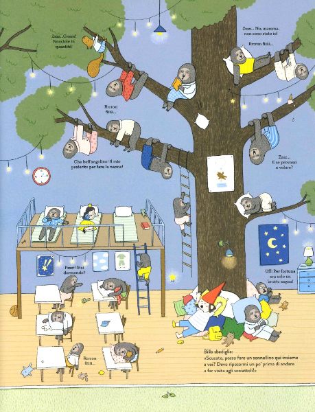 Prima tappa alla scuola dei topolini, chiassosi e un po' disordinati ma anche molto ingegnosi, poi è la volta dei coniglietti che vanno a scuola sotto un campo di carote: dove altrimenti?