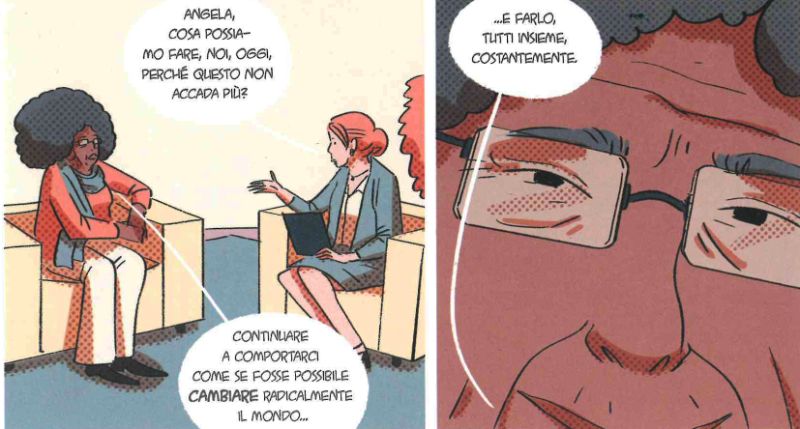Mette subito le cose in chiaro Mariapaola Pesce, l’autrice di questo graphic novel, inserendo questa bellissima citazione a grandi caratteri già nella copertina, con al centro un pugno chiuso e il volto di Angela Davis con la sua inconfondibile capigliatura.