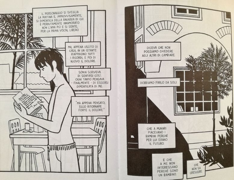Le ragazze nello studio di Munari (Bao Publishing) è un racconto intimo del confronto tra Fabio, rivenditore di libri usati di grande pregio, e il suo rapporto con tre donne, Chiara, Sonia e Fedra. Incapace di rimanere a lungo in una storia, Fabio presenta il carattere disilluso di chi tenta di sfuggire alla paura dell’innamoramento e alle sofferenze che questo comporta, cercando la fuga nella quantità delle relazioni: “Ho sempre cercato di trovare l’amore nella quantità, come Bertrand. E nei capelli delle ragazze”, si ritrova a pensare. Ma è anche la storia di un giovane che – tra la precarietà di uno scaffale pieno di libri e di poster di vecchi film – è alla ricerca di se stesso e di un equilibrio.