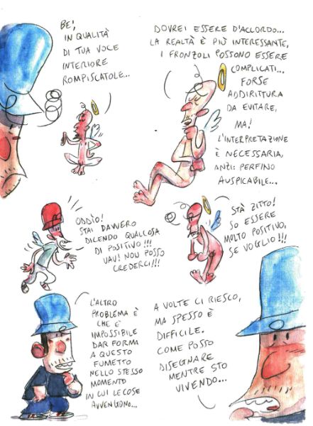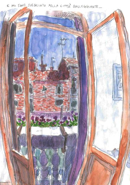 Su un lungo volo diretto a Venezia, Enrico discute con le vocine (personificate) della sua coscienza su come fare a rendere interessante e allo stesso tempo accurato questo fumetto. Ovviamente non può certo disegnare mentre gioca a tennis o cammina, perciò ha dovuto trovare un’altra soluzione: ricostruire il viaggio combinando le illustrazioni che ha fatto con la sua memoria.